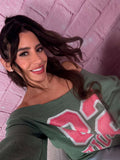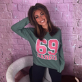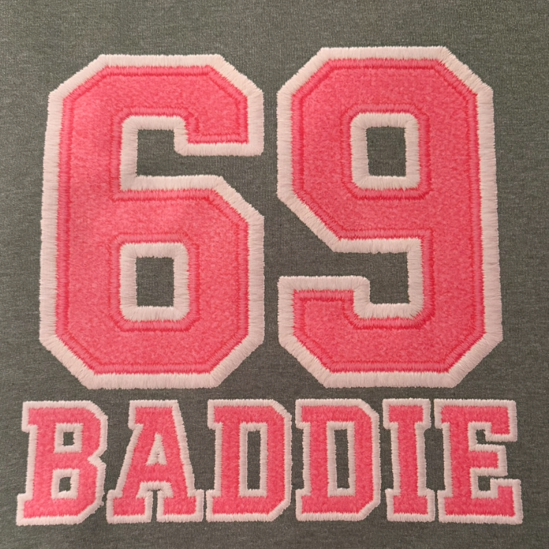 this 60/40 preshrunk cotton/polyester crewneck sweatshirt is a heather army green, detailed with a pink ‘69 Baddie’ faux patch, with ribbed cuffs and waistband.